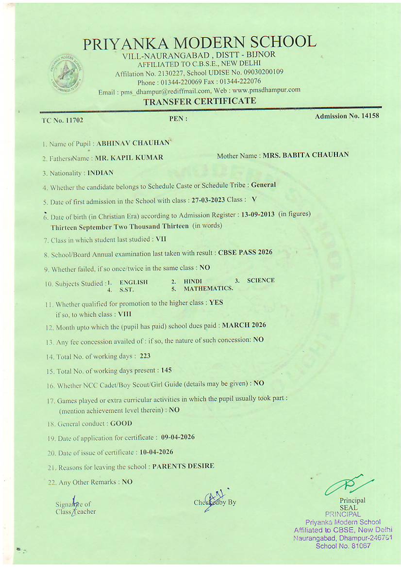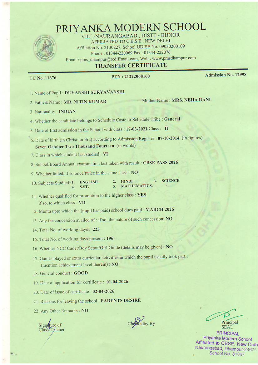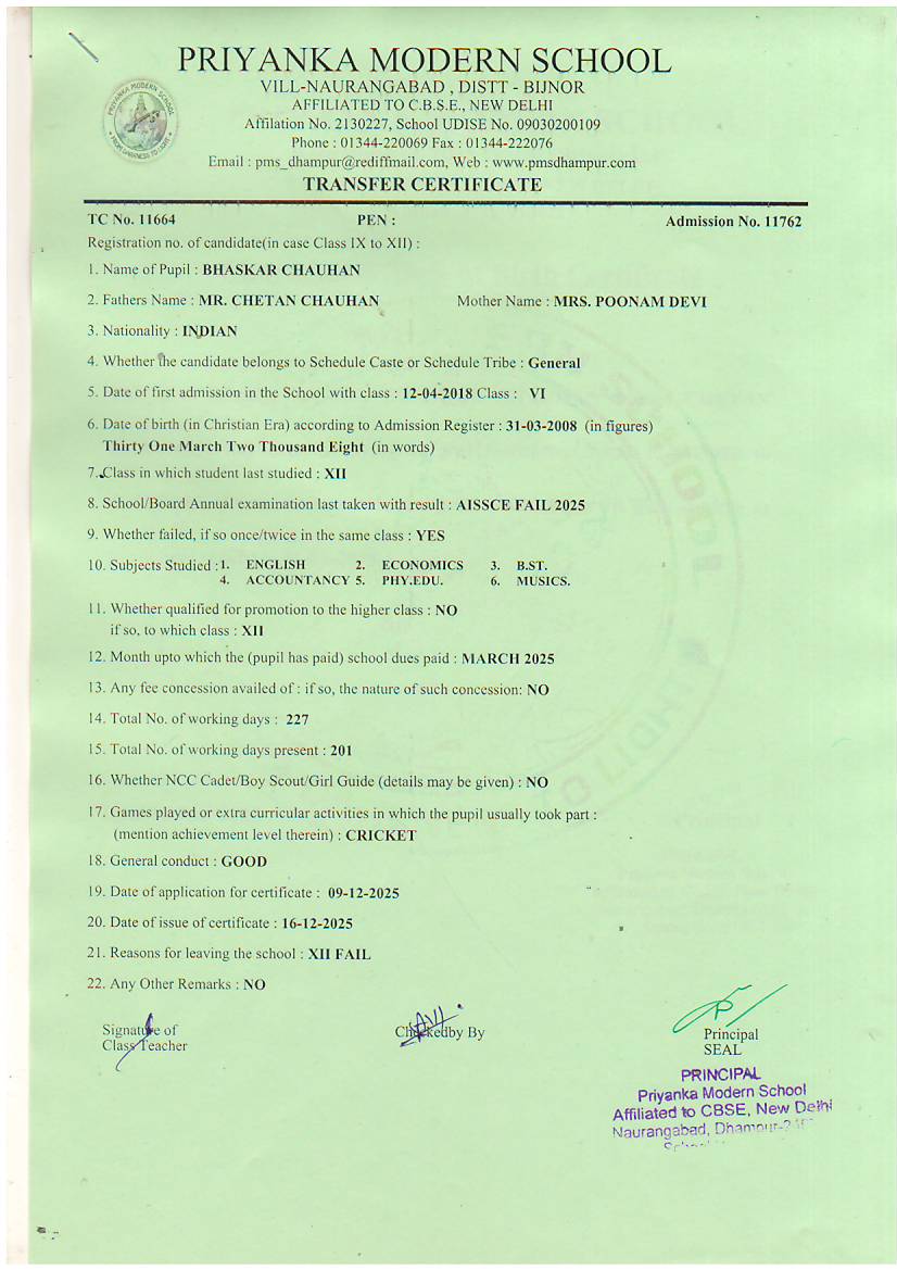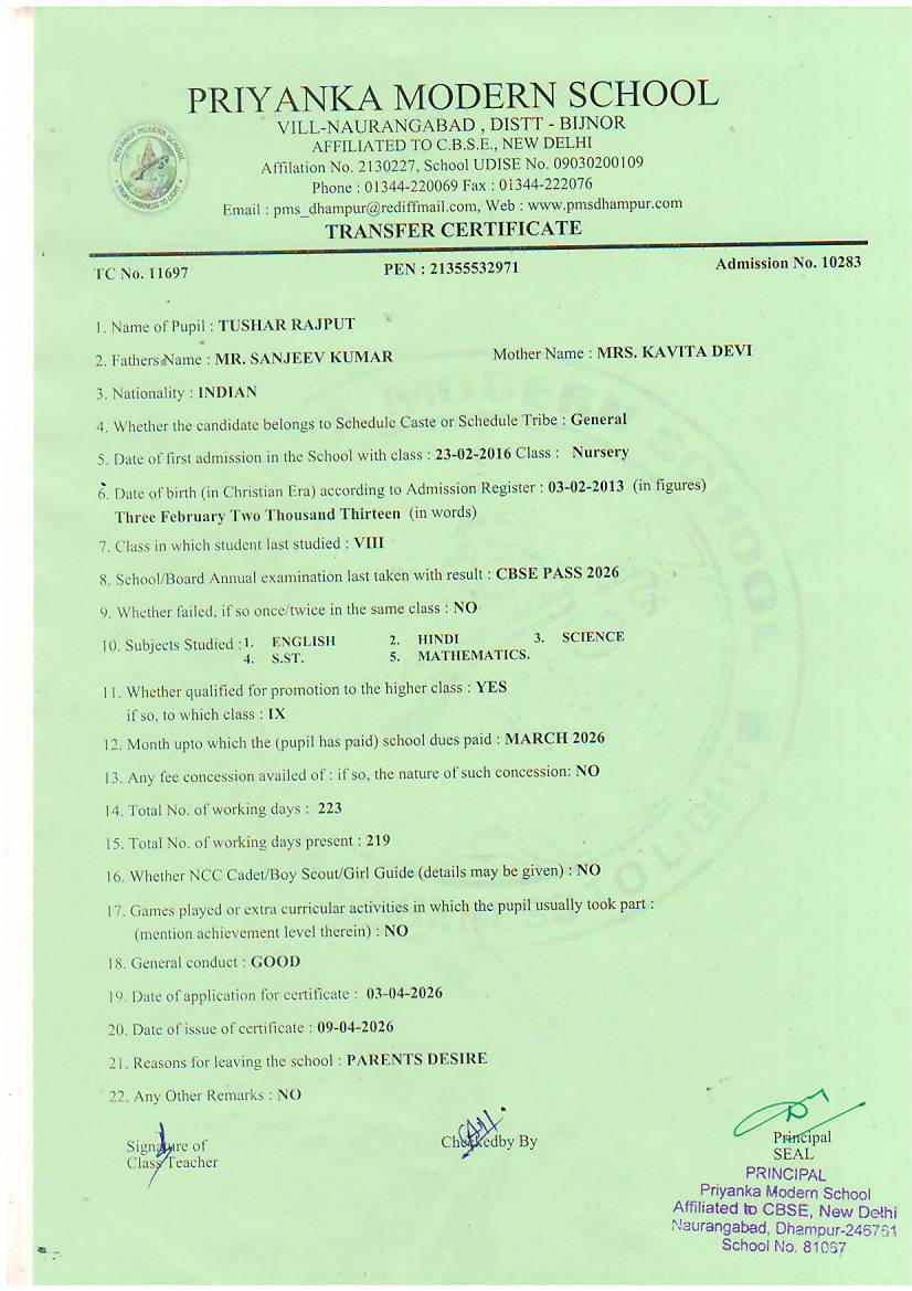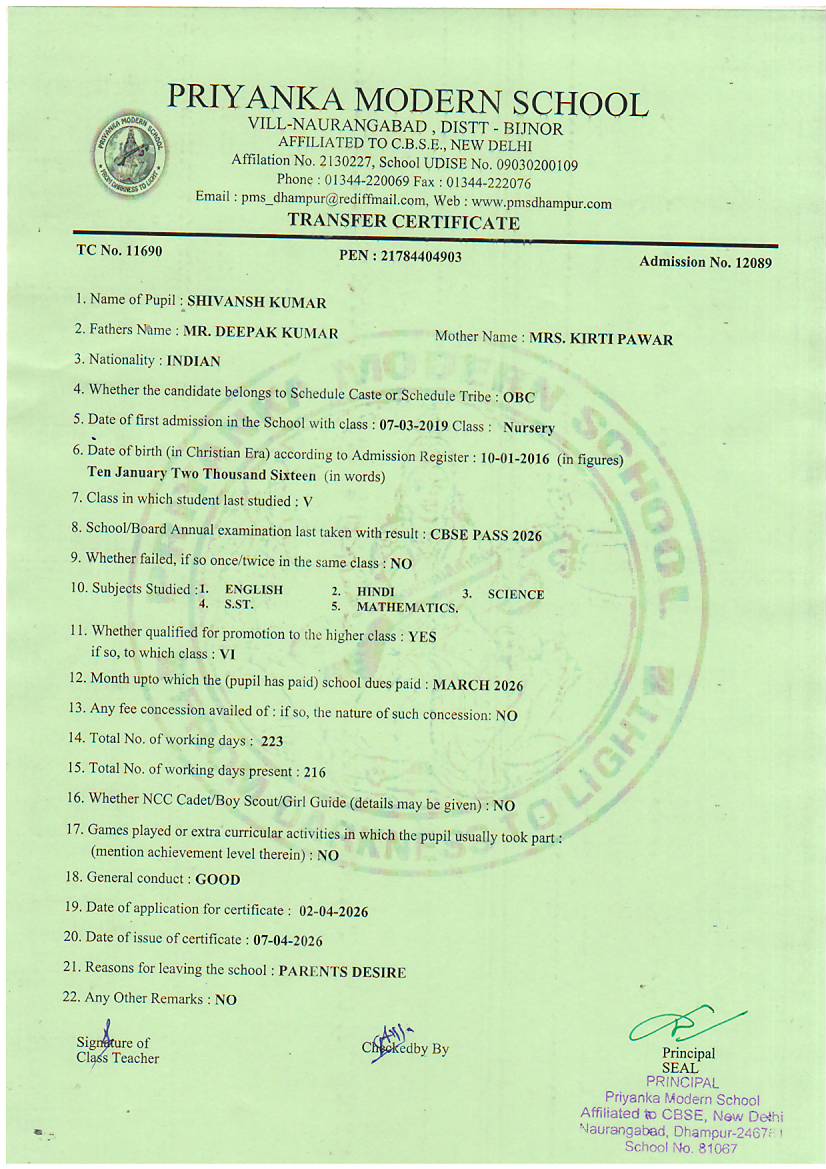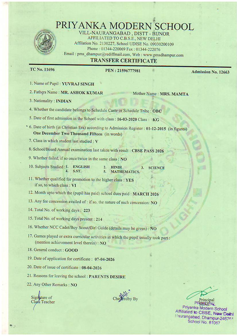 TCs issued by PMS Dhampur