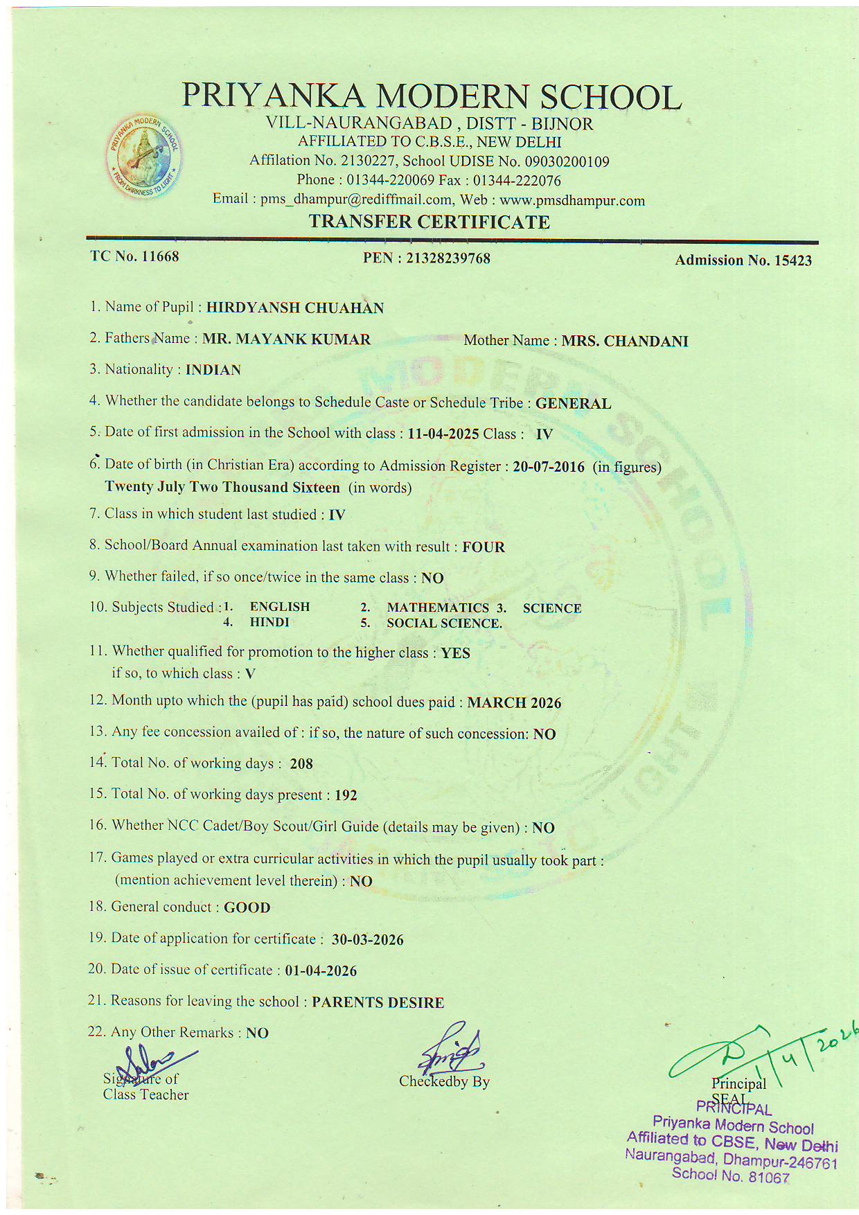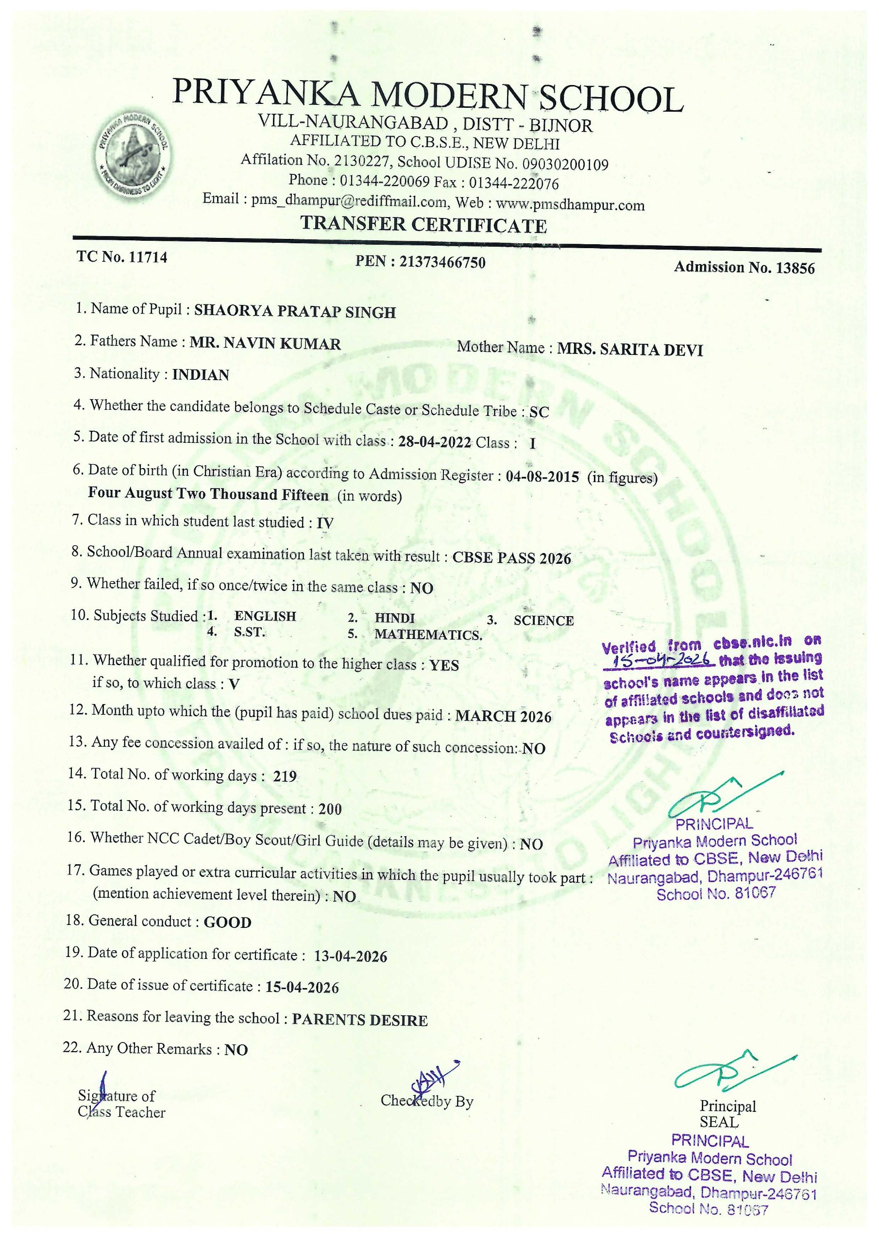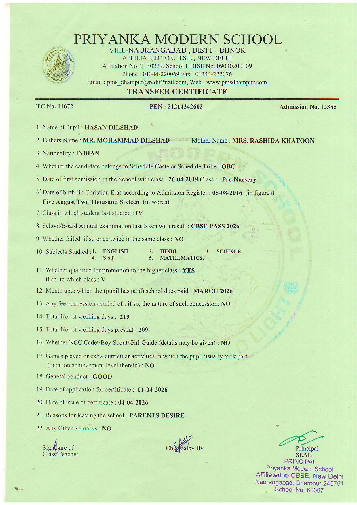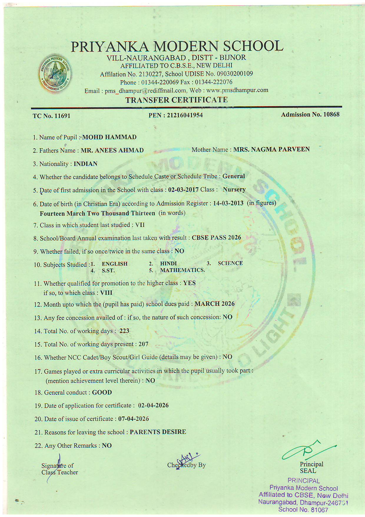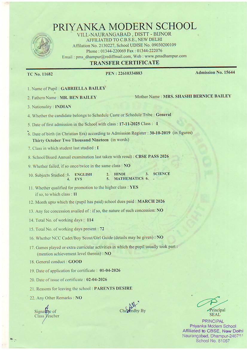 TCs issued by PMS Dhampur